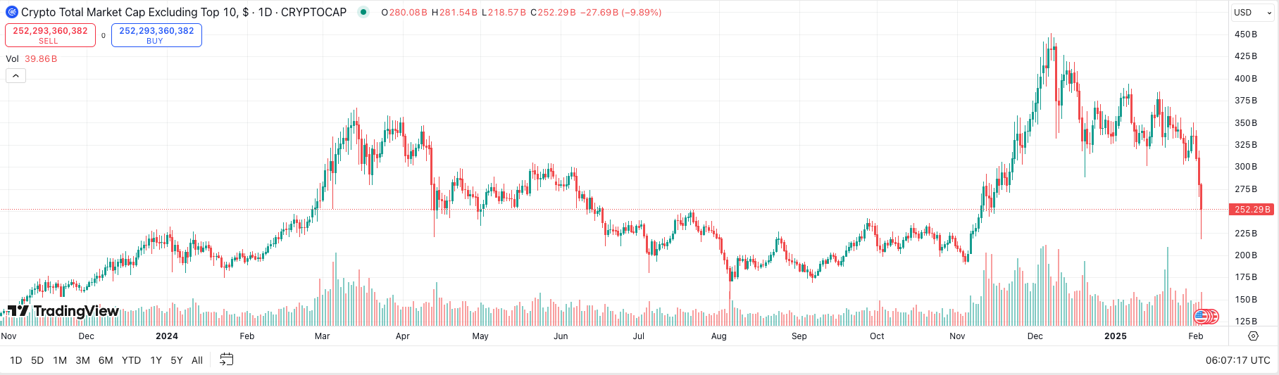 TradingView 统计的排除市值前十的加密货币外其他加密货币市值总和今晨最低跌至 2200 亿美元附近,已达到了去年 8 月至 10 月的水平。
