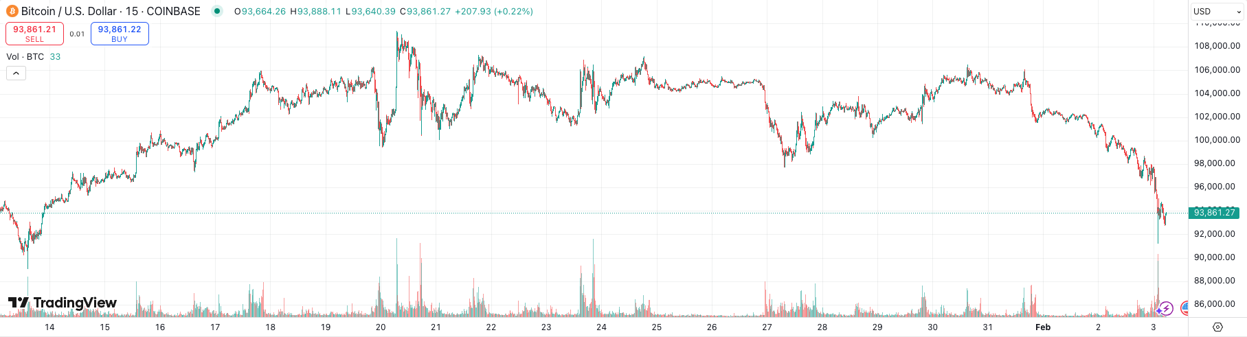 一周前,因 DeepSeek 导致投资者对人工智能芯片产业链未来需求可能降低的预期,美股市场包括英伟达、AMD 在内的股票从夜盘就开始了下跌,而近期一直跟随美股走势的比特币也被拖累。今日早间亚盘时间,美股夜盘时间,或许是受到周六美国政府宣布将对墨西哥和加拿大进口商品加征 25% 的关税,对中国进口商品加征 10% 的关税的影响,比特币在周末的小幅下跌后持续跌势,在香港时间 10 时左右跌至接近 9.1 万美元附近。