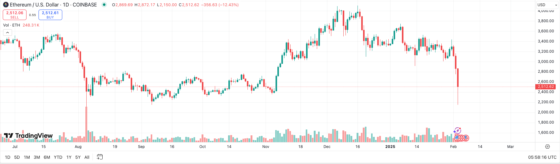 其实比特币在今日早间的跌幅并不算大,但包括以太坊在内的大多数代币缺出现了断崖式的下跌,以太坊近三日最大跌幅约 40%,今早最低跌至 2100 美元附近,大量山寨币更是创下了 2022 年熊市以来的新低。
