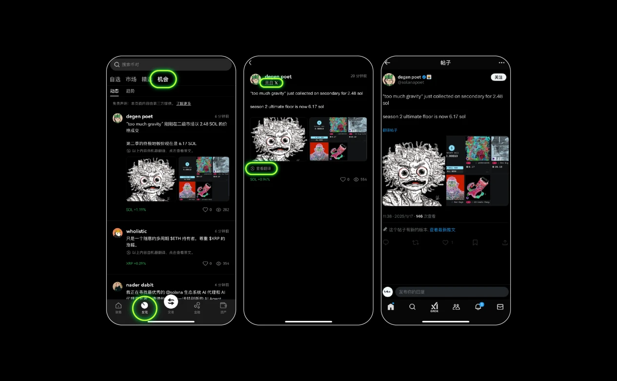 此外,“动态”内置的实时翻译功能,解决了全球语言障碍的问题。 加密市场的热点往往从海外讨论中率先升温,但语言障碍让许多用户错失了关键信息。OKX“动态”功能内置实时翻译技术,无论是推特的英文资讯,还是其他语言的讨论,都能同步呈现为你熟悉的语言。从中英文圈 KOL 观点到其他国家对 Token 的偏好,你都可以一目了然,轻松了解全球化的市场动态。“动态”功能不仅打破了语言的边界,更让你以全球化的视野洞察市场趋势,站在更广阔的视野上做出决策,在变化中抢占先机。