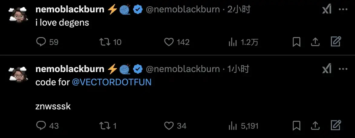 不知道是否是一种营销手段,dev 钱包的收益被人在另一款链上社交 App「VECTORDOTFUN」上发现并爆料在 X 上,而当前收益已经接近 250 万美元,随后 dev「nemoblackburn」甚至还在推特上分享了一个 Vectordotfun 的内测邀请码,并置顶推文「i love degens」整体运营氛围充满了 Degen 的气息。