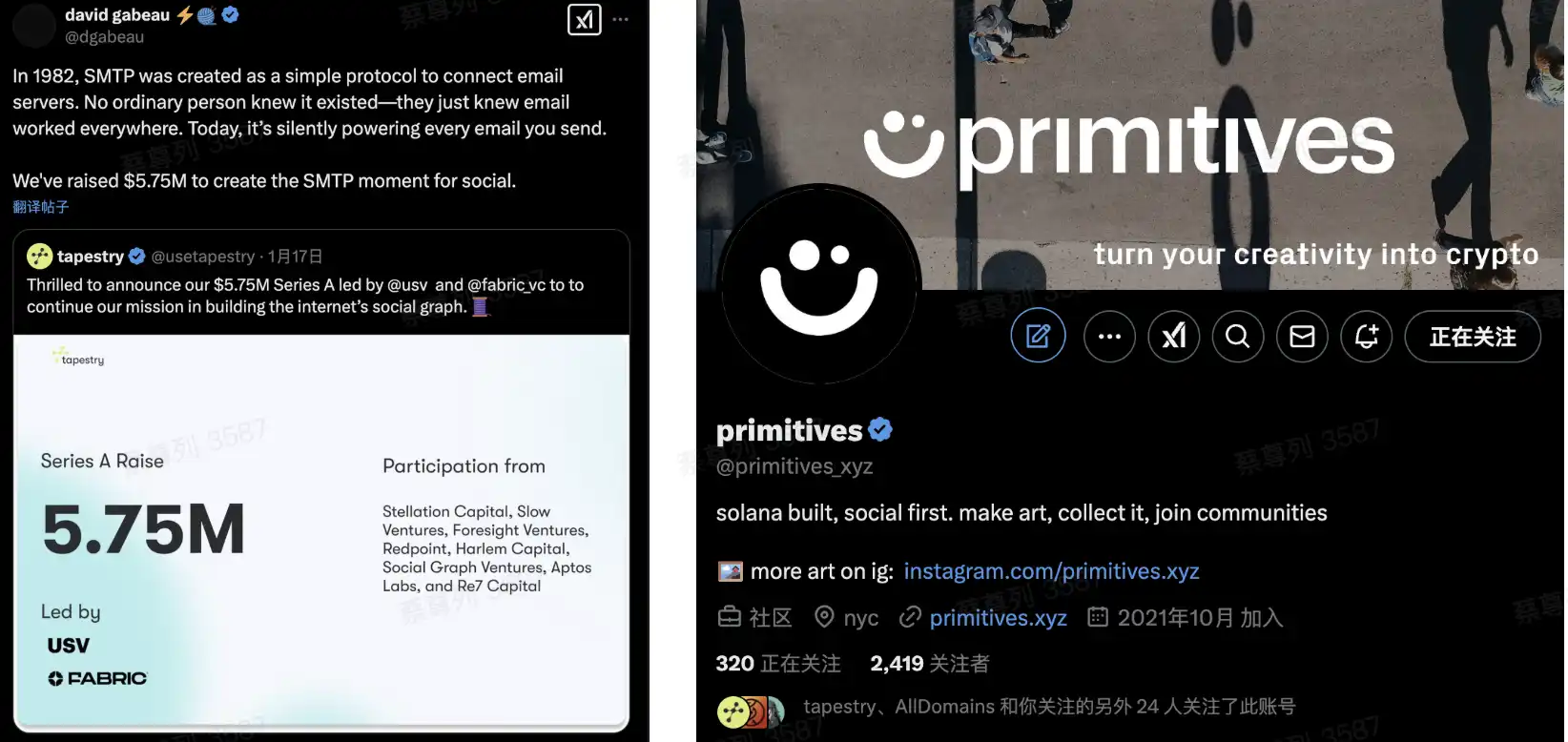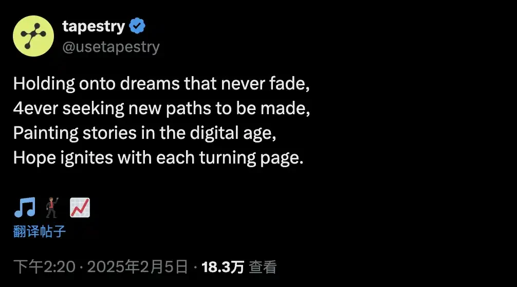 1 月 17 号 Tapestry 宣布 A 轮融资由 Fabric Ventures 和创始人的前东家 Union Square Venture 领投 Aptos 和 Foresight、Social Graph 等机构跟投用 7000 万美元的估值融资了 575 万美元。创始人 David Gabeau 转发融资信息上将 Tapestry 比作电子邮件的协议 SMTP,从某种意义上链上地址和电子邮件确实有许多的相似之处。