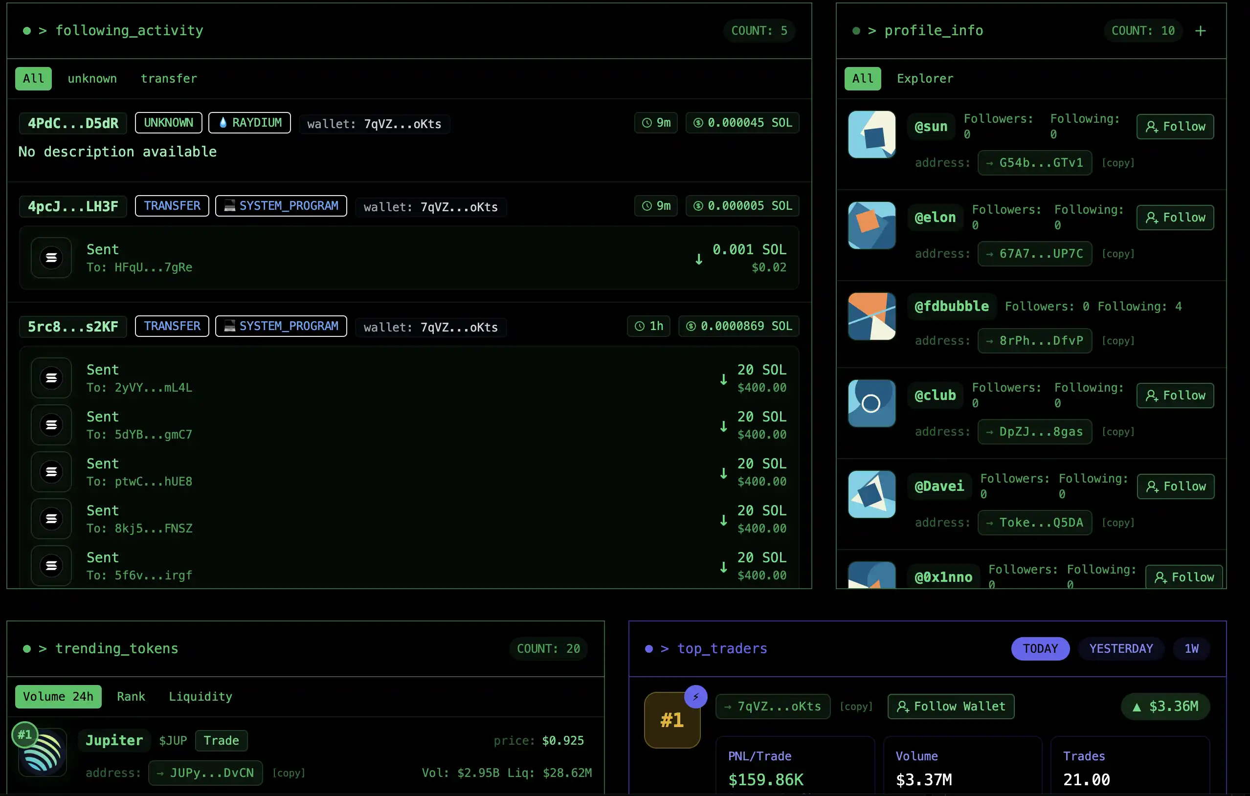 SSE 是 Solana 上追踪和确认顶级交易者的社交区块链数据。它为用户提供自动化工具和洞察,帮助优化代币交易决策,主要是跟踪地址活动、热门代币、顶级交易者以及提供其地址与用户的社交图谱,可以说将链上、社交、交易以及 AI 资料集概念孜然一身。