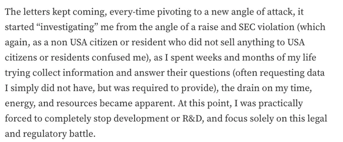 译文:那些信件接连不断地寄来,每次都换一个新的攻击角度。最初,他们以融资和 SEC 违规的名义对我展开“调查”,这让我十分困惑——毕竟,我既不是美国公民,也不是美国居民,更没有向美国公民或居民出售任何东西。