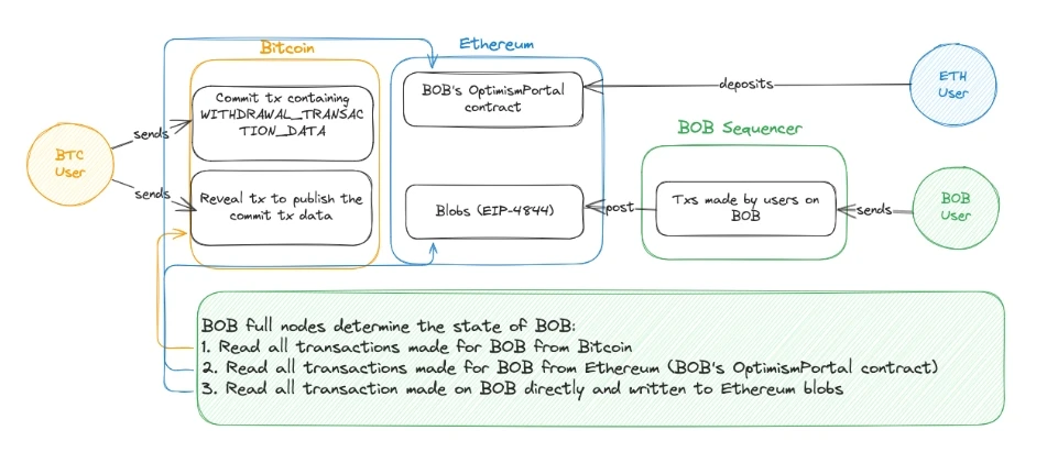 所以,这对用户来说使用体验还不够友好,比特币用户只需要比特币网络上的 BTC 就可以将他们的 BTC 从 BOB 提取回比特币。BOB 正在研究一种混合解决方案:默认使用以太坊作为 DA 层,同时允许用户通过比特币上的特殊交易强制包含 BOB 上的交易。