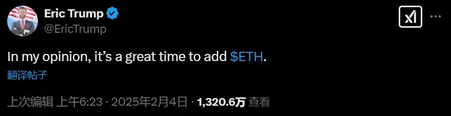 而在转移资产这一敏感时间点,特朗普次子 Eric Trump 就在其社交平台表示,现在是增持 ETH 的最佳时机(In my opinion, it『s a great time to add ETH.)。推文最初版本中后面还有一句「你们之后可以来感谢我(You can thank me later.)」。