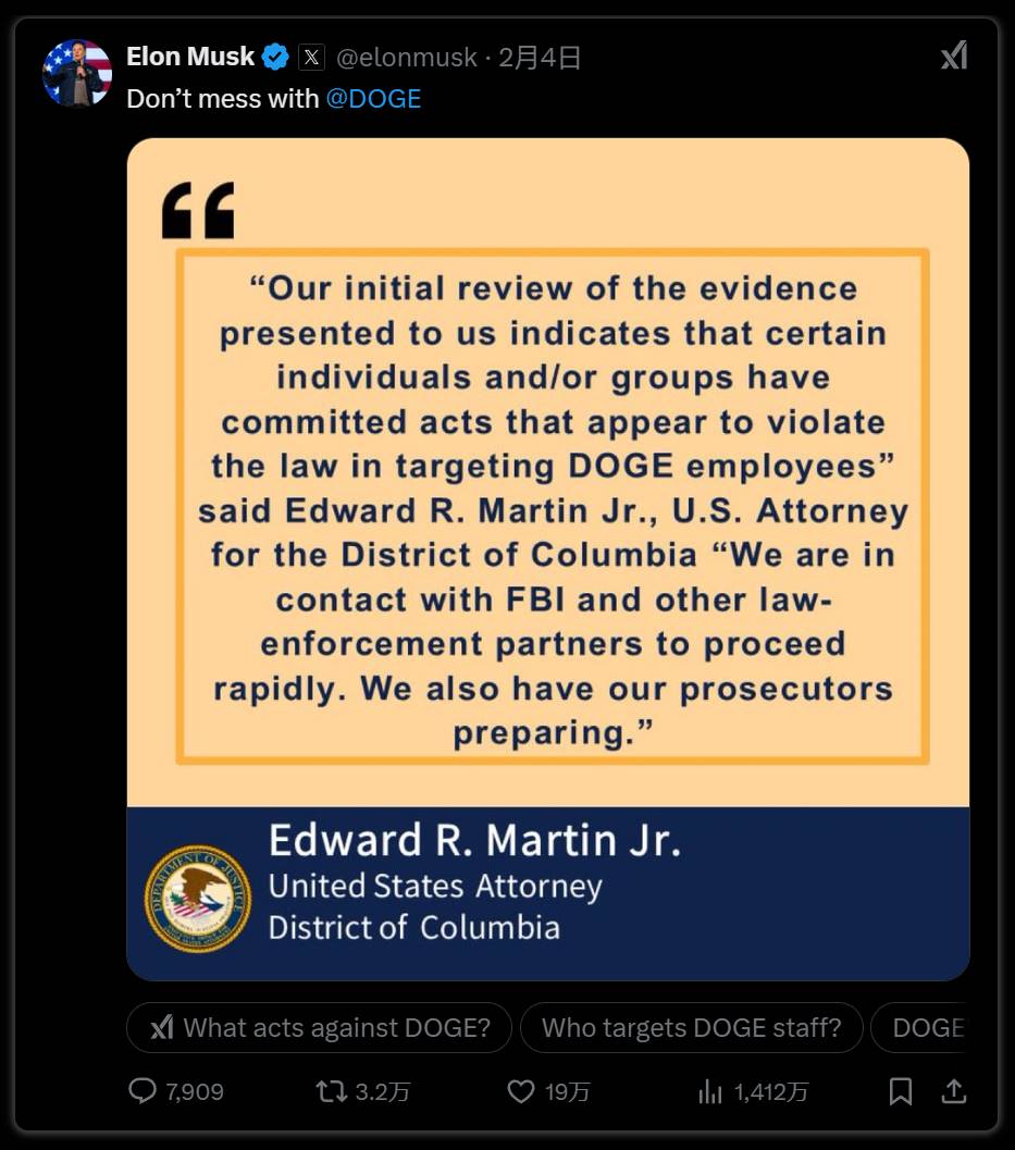 - 另外,马斯克,在 D.O.G.E 部门正在拼命工作;