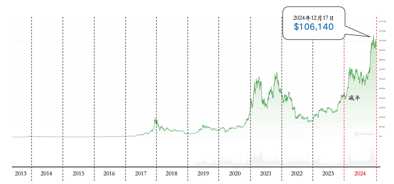 比特币(BTC)价格从年初的约 4 万美元上涨至 12 月的超过 10 万美元,涨幅超过 150% 。比特币 ETF 的推出和机构投资者的大量买入是推动其价格上涨的主要因素。许多其他加密货币也表现出色,例如,本轮周期中 Memecoin 和 AI+Crypto 等市场表现突出。