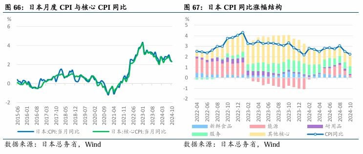 通胀方面,日本逐步摆脱通缩, 1-10 月整体 CPI 及剔除生鲜食品的核心 CPI 均超过 2% 。最高点 8 月的 CPI 和核心 CPI 分别同比上涨 3% 和 2.8% , 10 月日本 CPI 和核心 CPI 同比上涨 2.3% 和 2.2% 。诸多因素共同推动日本逐步摆脱通缩,包括工资增长,本年度春季劳资谈判工资涨幅为 5.1% (基本工资涨幅为 3.56% ),截至 10 月,劳动者的基本工资同比增长 2.7% ;价格转嫁上涨,企业价格自 2022 年至 2023 年大幅增长, 2024 年虽增幅缩小但仍持续上涨,服务价格自 2023 年以后也随着工资上涨加速而明显提高;物价预期上涨,日本银行 12 月调查的企业物价预期中,“物价总体预期”在 1 年后同比增长 2.4% 、 3 年后增长 2.3% 、 5 年后增长 2.2% ,呈现稳定上涨态势。