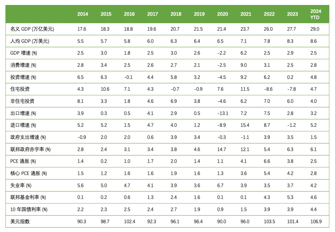 2024 年,美国经济增长 2.7% ,主要由家庭消费、企业投资、政府支出和出口推动。家庭消费因就业市场稳健、工资增长和低利率支撑,预计全年增速 2.6% ,对 GDP 贡献 1.7 个百分点。企业投资受盈利强劲、AI 技术革命和财政补贴支持,预计全年增速 3.7% 。政府支出因高财政赤字,预计增速 3.5% 。出口因海外需求和供应链改善,预计增速 3.4% 。
