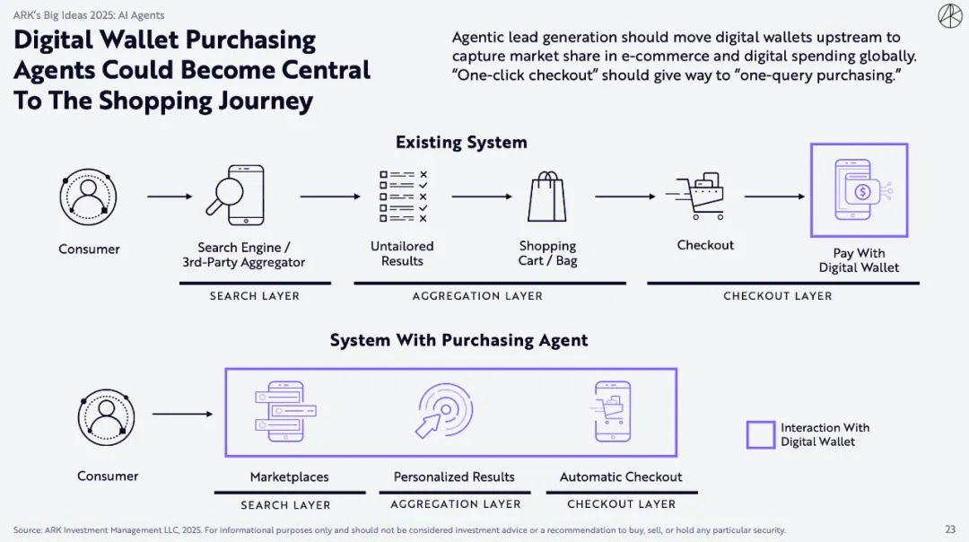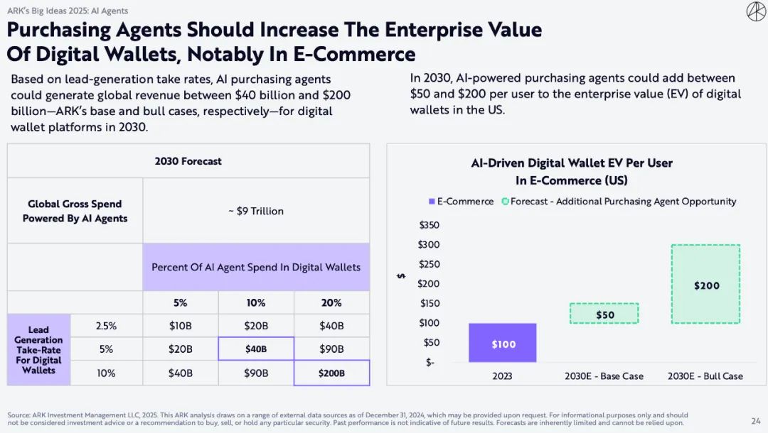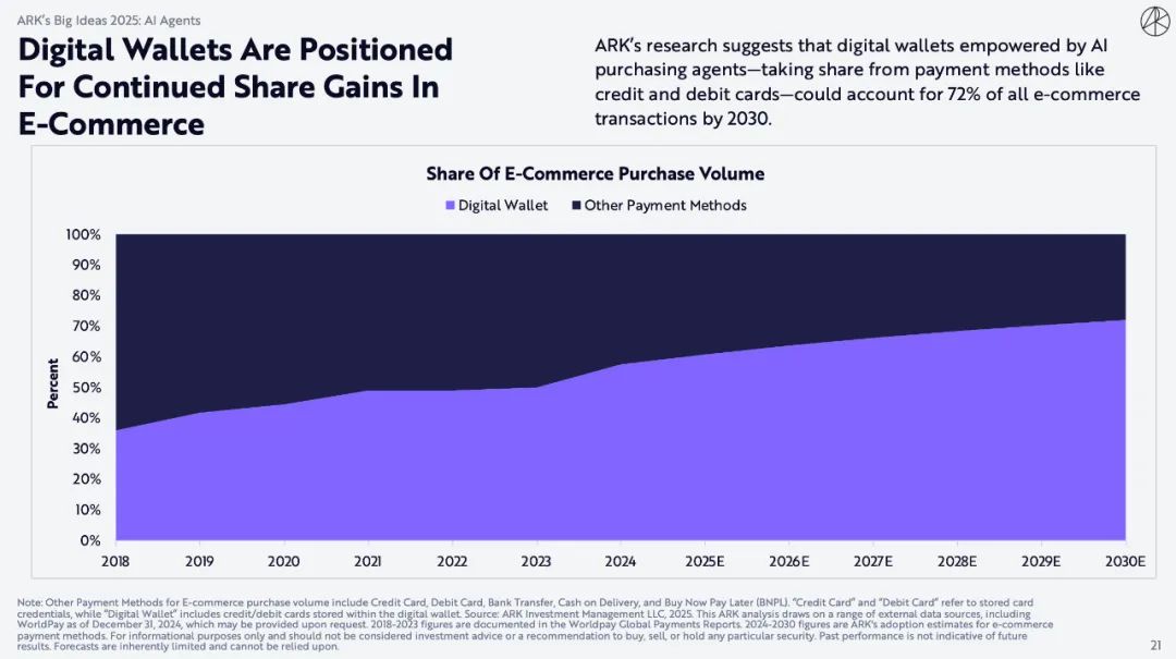 ARK的研究表明,到2030年,由人工智能采购代理支持的数字钱包(取代信用卡和借记卡等支付方式)可能占到所有电子商务交易的 72%。