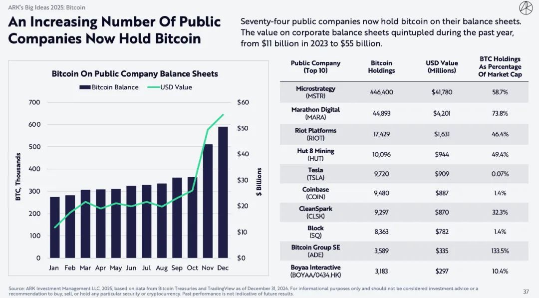 目前有74家上市公司在资产负债表上持有比特币。在过去一年里,公司资产负债表上的价值翻了五倍,从2023年的110亿美元增加到550亿美元。