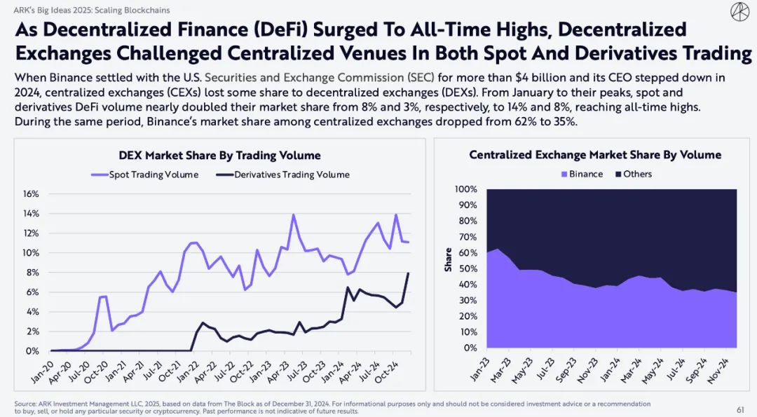 当币安与美国证券交易委员会 (SEC) 达成超过40亿美元的和解协议,其首席执行官于2024年卸任时,中心化交易所 (CEX) 失去了一些份额,被去中心化交易所 (DEX) 抢占。从1月到高峰,现货和衍生品 DeFi 交易量几乎翻了一番,市场份额分别从8%和3%增至14%和8%,创下历史新高。同期,币安在中心化交易所中的市场份额从62%下降到35%。