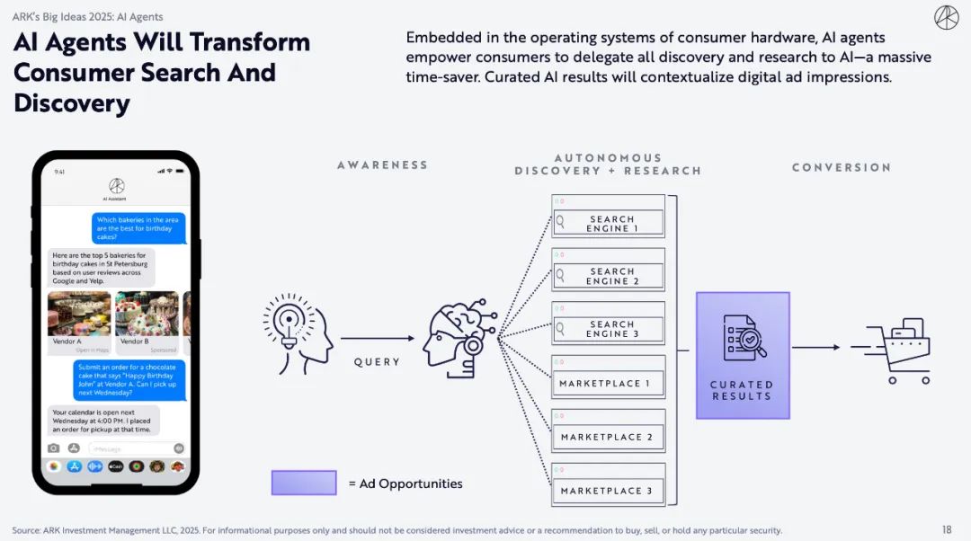 AI Agents嵌入在消费者硬件的操作系统中,使消费者能够将所有发现和研究委托给AI,从而节省大量时间。精心策划的 AI结果将使数字广告印象更具情境性。
