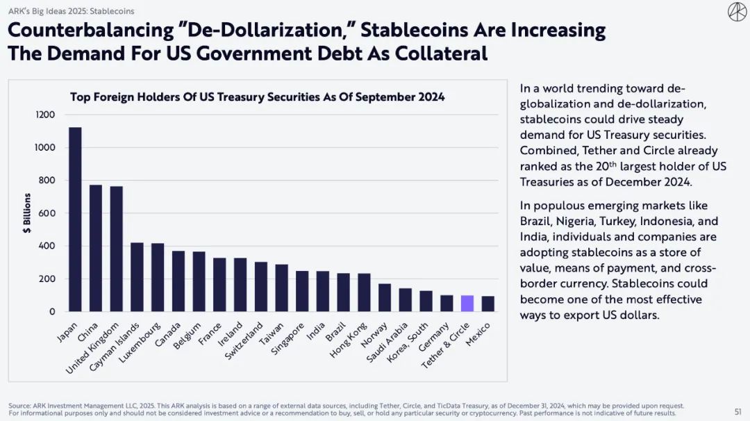 在一个走向去全球化和去美元化的世界中,稳定币可能会推动对美国国债的稳定需求。截至2024年12月,Tether和Circle合计已成为美国国债的第20大持有者。