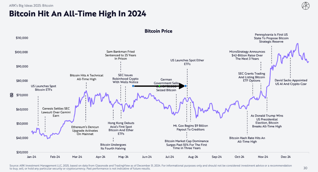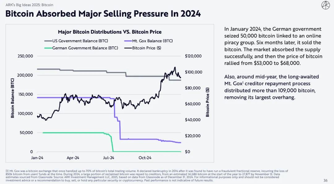 2024年1月,德国政府查获了与网络盗版集团有关的50,000枚比特币。六个月后,它出售了这些比特币。市场成功吸收了供应,然后比特币的价格从 53,000 美元上涨至 68,000 美元。此外,在年中左右,期待已久的 Mt. Gox1 债权人偿还程序分发了超过109,000枚比特币,消除了其最大的悬而未决的问题。