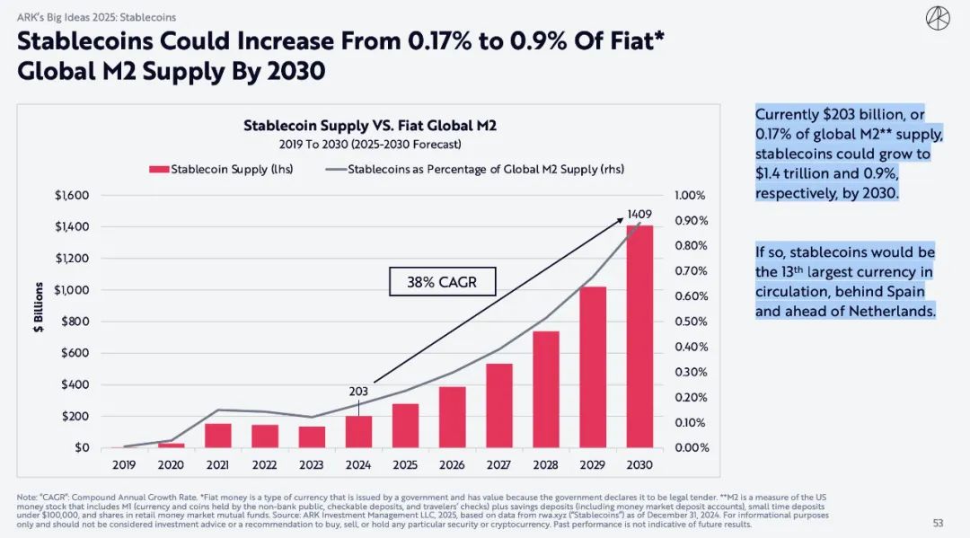 目前稳定币为2030亿美元,占全球M2供应量的0.17%,到2030年,稳定币可能分别增至1.4万亿美元和0.9%。