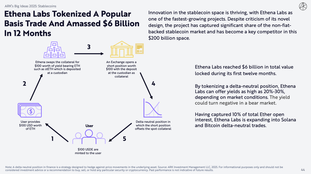 Ethena Labs在头12个月内锁定的总价值达到 60 亿美元。通过将 Delta中性仓位代币化,Ethena Labs可以提供高达20%-30%的收益率,具体取决于市场情况。在熊市中,收益率可能会变为负值。Ethena Labs已经占据以太坊总持仓量的10%,并正在向Solana和比特币delta-neutral交易扩展。