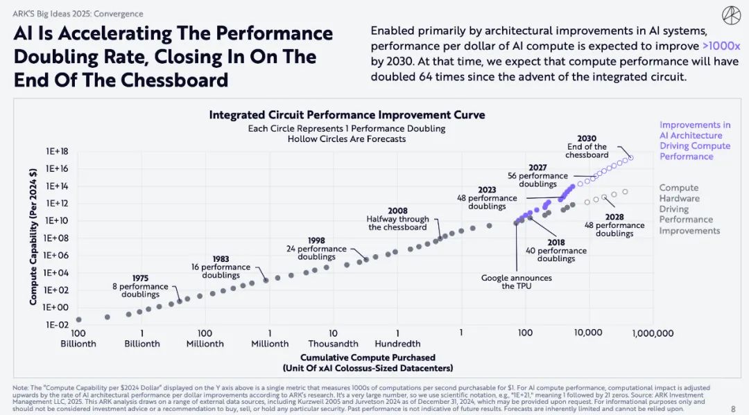 主要得益于人工智能系统架构的改进,到 2030 年,人工智能计算的每美元性能预计将提高 1000 倍以上。届时,我们预计计算性能将比集成电路问世时翻倍64倍。