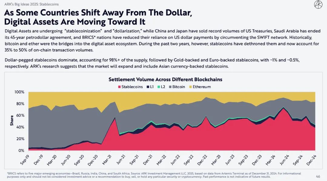 数字资产正在经历「稳定币化」和「美元化」,而中国和日本出售的美国国债数量创下历史新高,沙特阿拉伯结束了长达 45 年的石油美元协议,金砖国家通过绕过SWIFT网络减少了对美元支付的依赖。从历史上看,比特币和以太坊是进入数字资产生态系统的桥梁。然而,在过去两年里,稳定币已经取代了它们的地位,目前占链上交易量的 35%至50%。