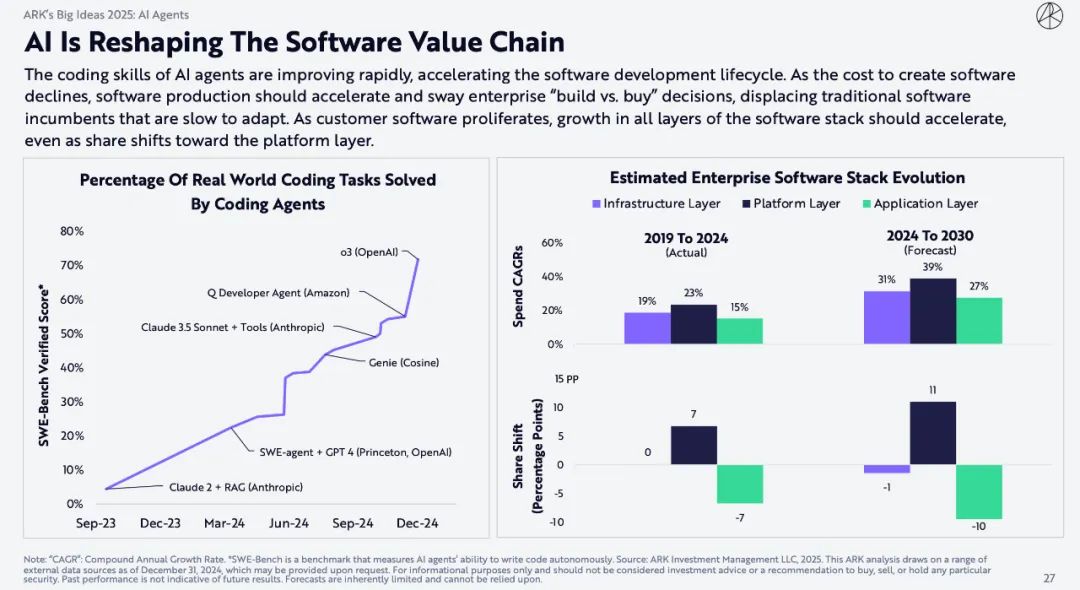 AI Agents的编码技能正在迅速提升,加速了软件开发周期。随着软件创建成本的下降,软件生产应该加速,并影响企业「自建还是购买」的决定,取代适应能力较弱的传统软件公司。随着客户软件的大量涌现,软件堆栈各层的增长应该加速,即使份额转向平台层也是如此。