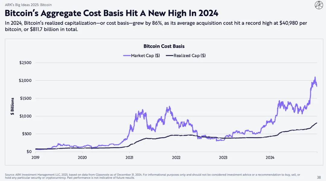 2024年,比特币的已实现资本化(或成本基础)增长86%,因为其平均收购成本创下历史新高,达到每比特币40980美元,总计8117亿美元。