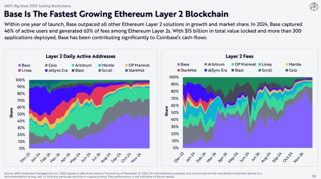 推出一年内,Base在增长和市场份额方面超越了所有其他以太坊第2层解决方案。2024年,Base占据了46%的活跃用户,并在以太坊第 2层中产生了63%的费用。凭借150亿美元的总锁仓价值和部署的 300多个应用程序,Base为Coinbase的现金流做出了重大贡献。