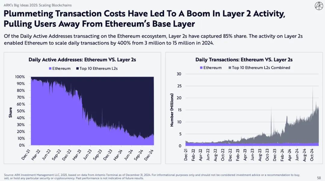 在以太坊生态系统中进行交易的每日活跃地址中,第2层占据了85%的份额。第2层上的活动使以太坊的每日交易量从300万增加到 2024年的1500万,增长了400%。