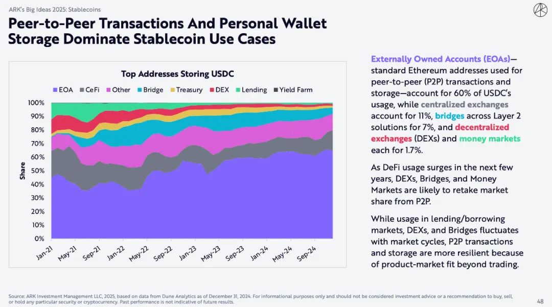 外部拥有账户 (EOA) — 用于点对点 (P2P) 交易和存储的标准以太坊地址 — 占USDC使用量的60%,而中心化交易所占11%,以太坊Layer2跨链桥占7%,去中心化交易所 (DEX) 和货币市场各占1.7%。