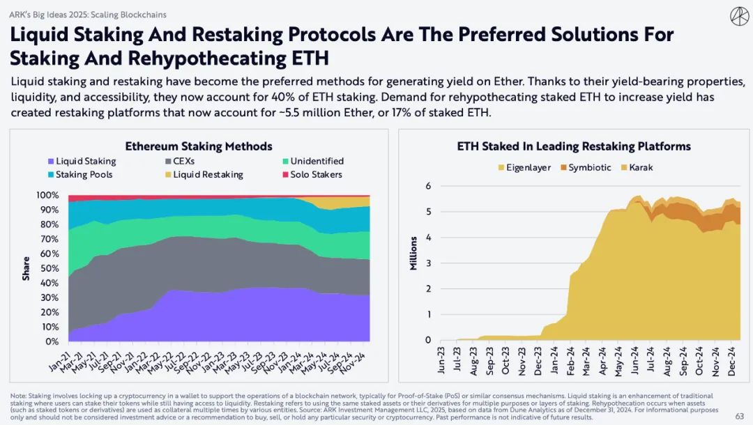流动性质押和再质押已成为产生Ether收益的首选方法。由于其具有收益特性、流动性和可访问性,它们现在占ETH质押的40%。为了增加收益而再质押ETH的需求催生了再质押平台,这些平台现在占质押的Ether约550 万,占质押ETH的17%。