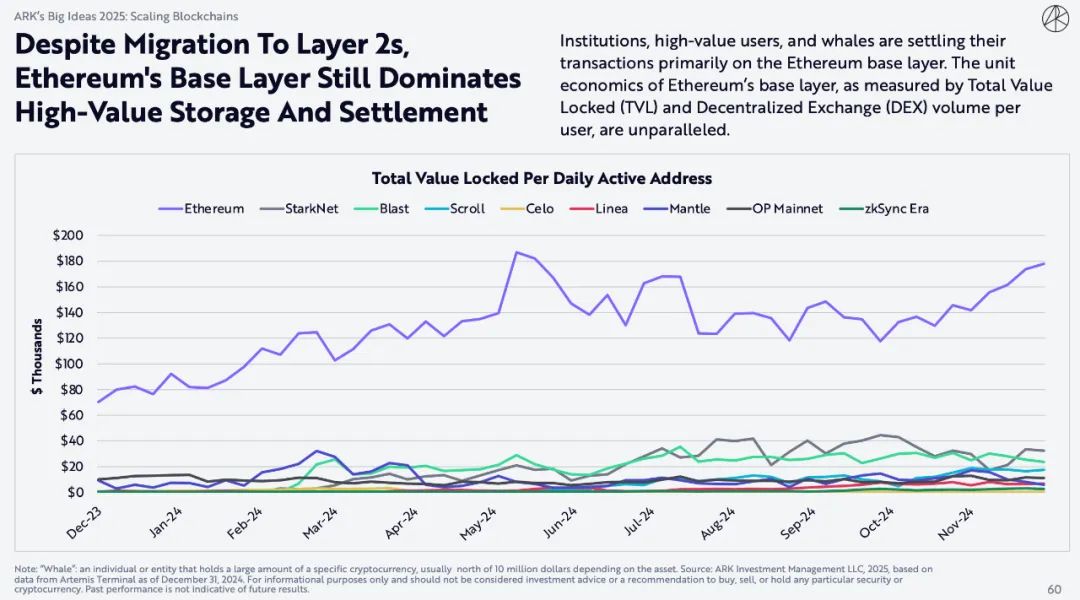 机构、高价值用户和鲸鱼主要在以太坊基础层上结算交易。以总锁仓价值 (TVL) 和每个用户的去中心化交易所 (DEX) 量衡量,以太坊基础层的单位经济效益是无与伦比的。