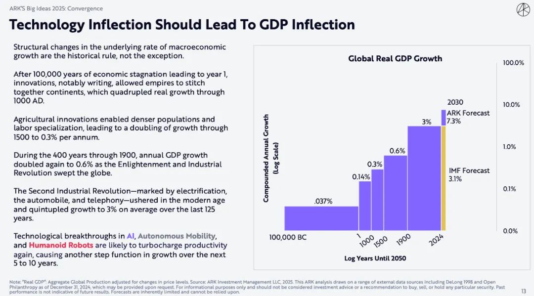 第二次工业革命以电气化、汽车和电话为标志,开启了现代时代,在过去125年中,平均增长率达到5倍,达到3%。人工智能、自动驾驶和仿生机器人方面的技术突破可能会再次提高生产力,在未来5到10年内实现另一个增长台阶。