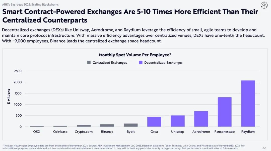 Uniswap、Aerodrome和Raydium等去中心化交易所 (DEX) 利用小型敏捷团队的效率来开发和维护核心协议基础设施。与中心化交易所相比,DEX具有巨大的效率优势,员工人数仅为中心化交易所的十分之一。币安拥有约9,000名员工,在中心化交易所领域员工人数方面处于领先地位。