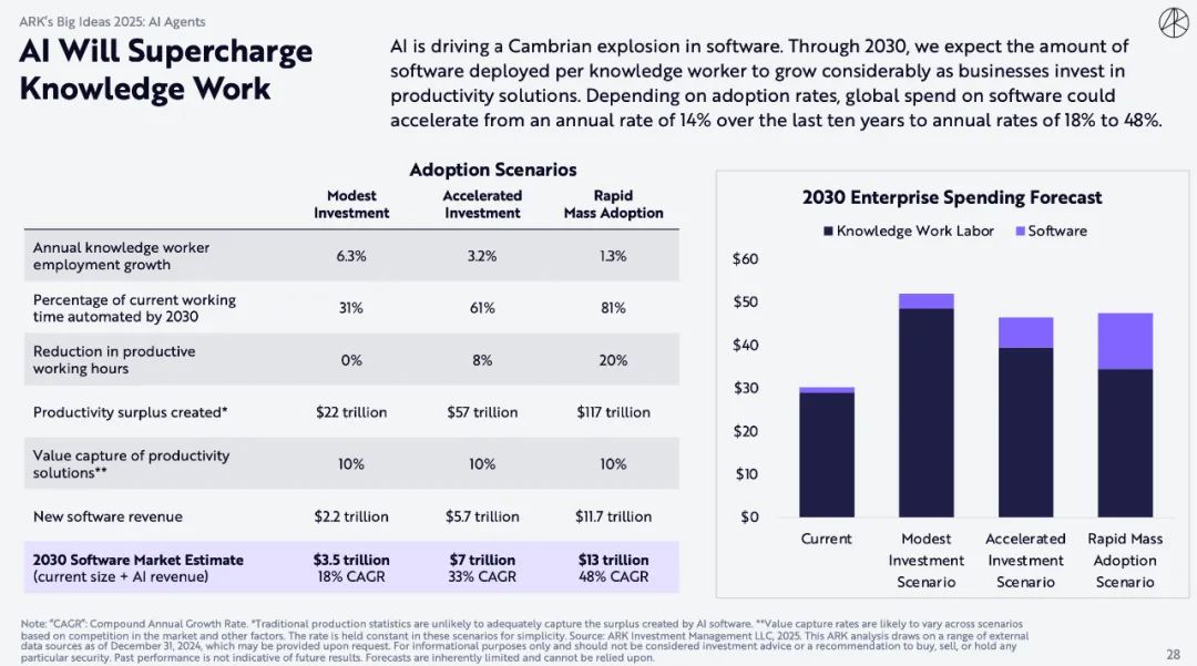 人工智能正在推动软件行业的寒武纪大爆发。到2030年,随着企业对生产力解决方案的投资,我们预计每位知识型员工部署的软件数量将大幅增长。根据采用率,全球软件支出可能会从过去10年的年均14%加速到年均18%至48%。