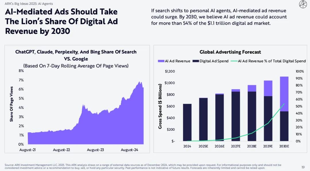 如果搜索转向个人AI Agents,人工智能广告收入可能会激增。到2030年,我们相信人工智能广告收入将占1.1万亿美元数字广告市场的54%以上。