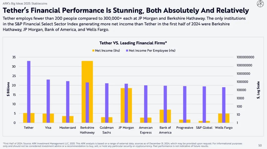 Tether的员工人数不到 200人,而摩根大通和伯克希尔哈撒韦公司的员工人数均超过300,000 人。2024年上半年,标准普尔金融精选行业指数中唯一净收入超过Tether 的机构是伯克希尔哈撒韦公司、摩根大通、美国银行和富国银行。