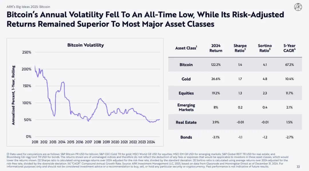 比特币年度波动率降至历史最低,但其风险调整后回报率仍优于大多数主要资产类别
