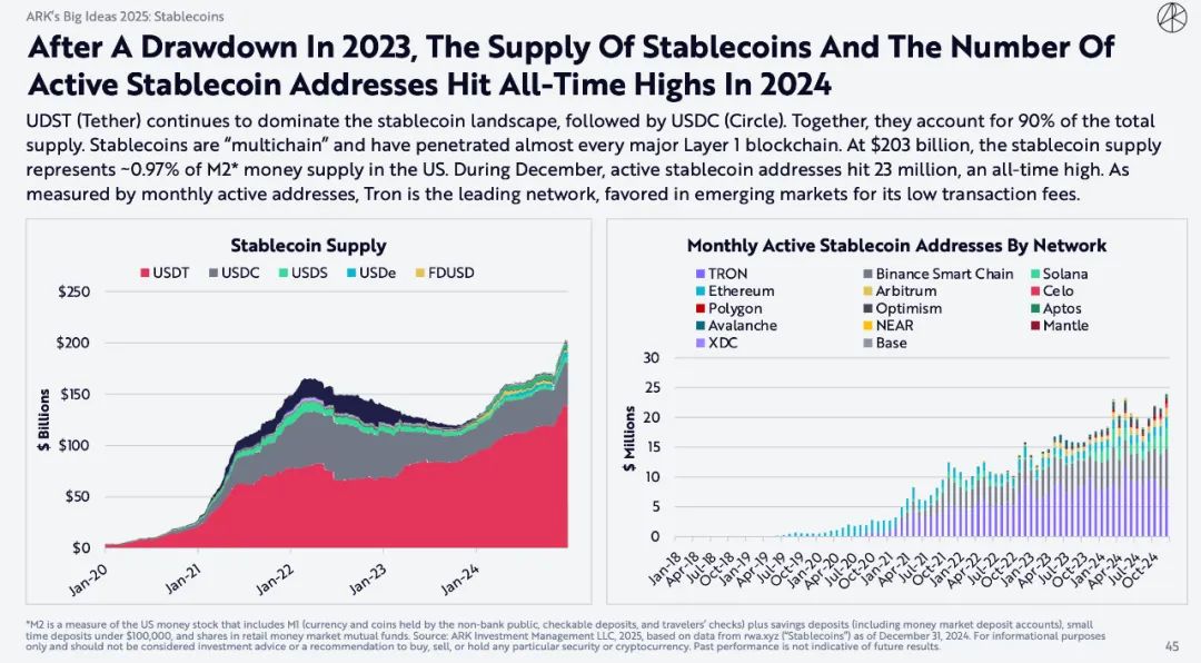 UDST(Tether)继续主导稳定币领域,其次是 USDC(Circle)。它们合计占总供应量的90%。稳定币是「多链」的,几乎渗透到了所有主要的第 1 层区块链。稳定币供应量为2030亿美元,占美国 M2货币供应量的约0.97%。12月,活跃稳定币地址达到2300万,创历史新高。按月活跃地址衡量,Tron是领先的网络,因其低交易费而受到新兴市场的青睐。