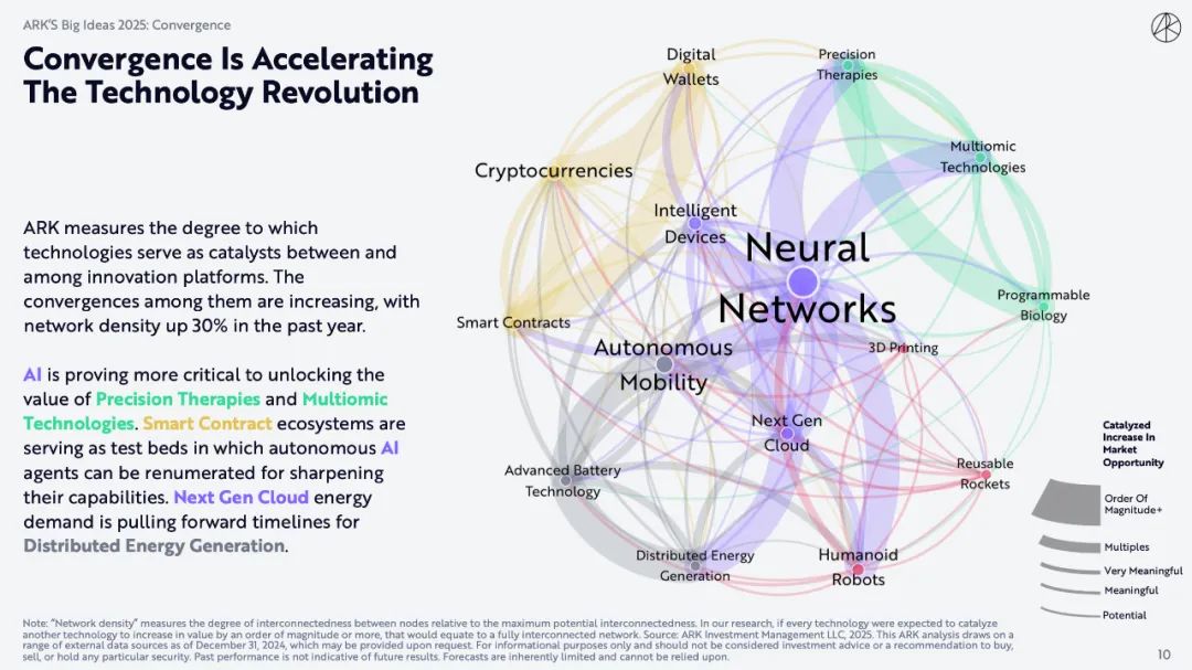 ARK衡量了技术在创新平台之间发挥催化剂作用的程度。它们之间的融合程度正在提高,网络密度在过去一年中提高了30%。
