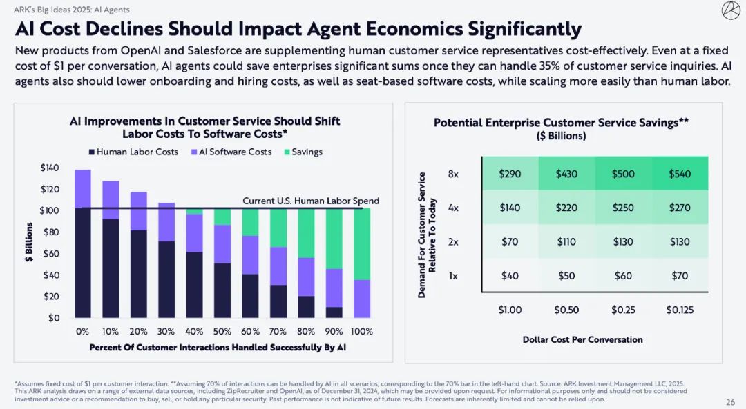 OpenAI和Salesforce的新产品正在以经济高效的方式补充人工客户服代表。即使每次对话的固定成本为1美元,只要AI Agents能够处理35%的客户服务咨询,就可以为企业节省大量资金。AI Agents还应降低入职和招聘成本以及基于席位的软件成本,同时比人工更容易扩展。