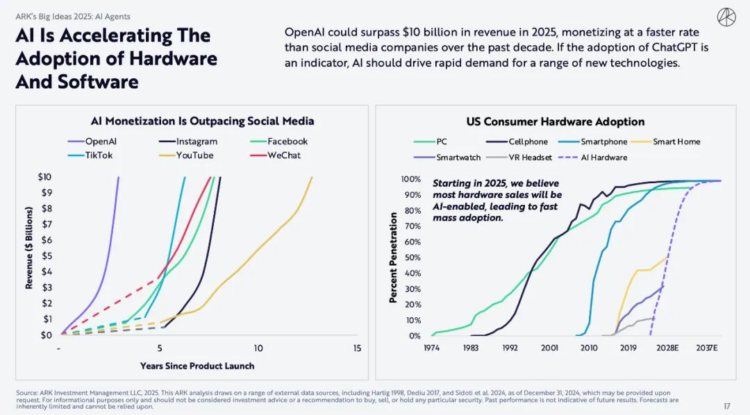 OpenAI 的收入可能在 2025 年超过 100 亿美元,其货币化速度比过去十年的社交媒体公司更快。如果 ChatGPT 的采用是一个指标,那么 AI 应该会推动对一系列新技术的快速需求。
