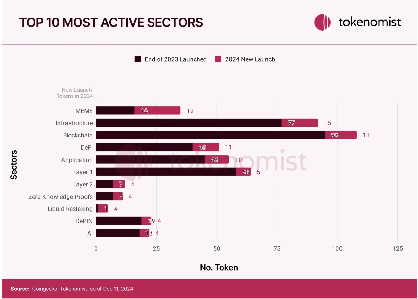 与更广泛的山寨币市场形成对比,一个领域的表现显著超过了其同行:Memecoin。这个领域在2024年展示了非凡的增长,实现了年初至今536%的回报——这一表现分别超过了比特币和以太坊177%和300%。值得注意的是,今年发行的市值前54个代币中,有19个是Memecoin。