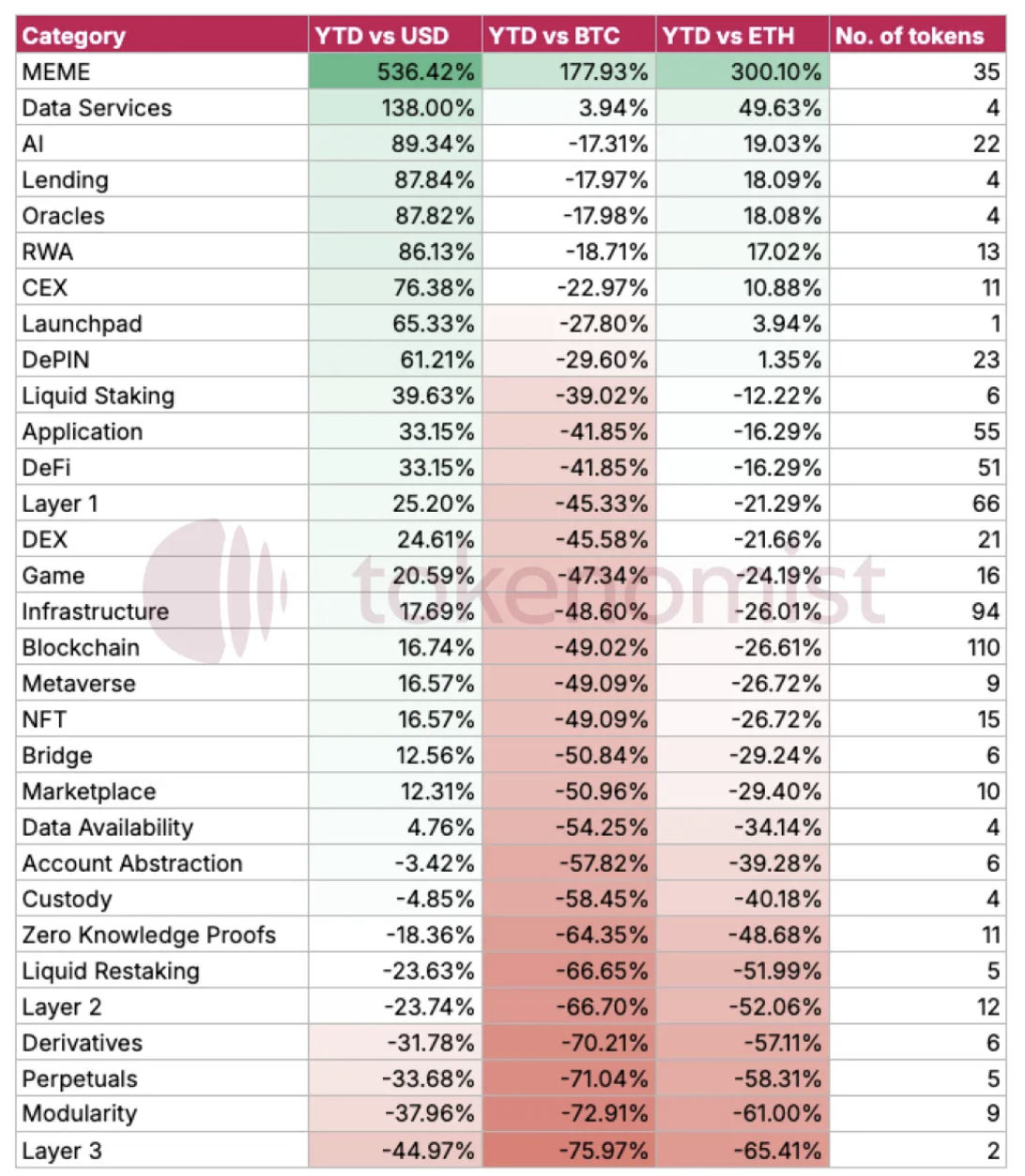 · 2024年MEME赛道回报率高达536%,远超比特币和以太坊的表现。