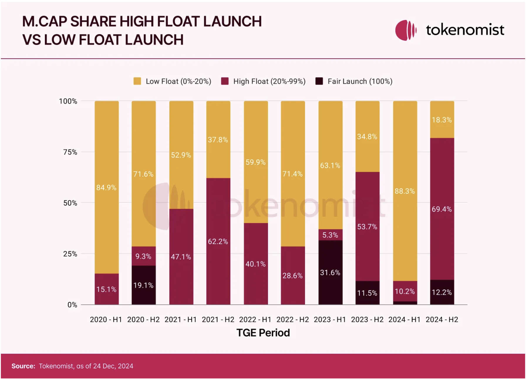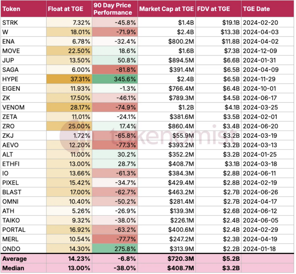 · 截至2024年底,代币发行时的平均流通量/FDV比例上升至35%;
