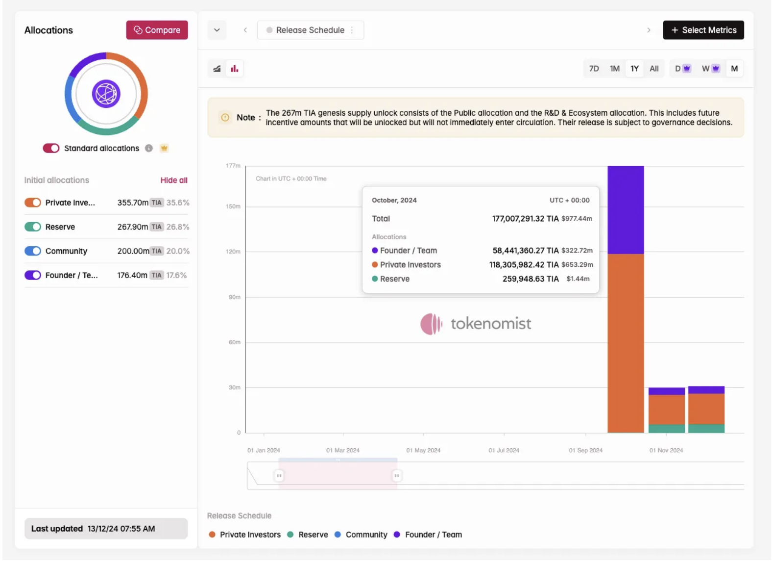 2024年10月,Celestia(TIA)启动了价值9.7744亿美元的重要解锁事件。这是TIA自TGE事件后的首次重大解锁,成为当年最大的代币解锁之一,且绝大多数分配给了私人投资者和创始人/团队。私人投资者和创始人/团队的解锁占据主导地位,确保了对长期贡献者和早期支持者的持续激励。