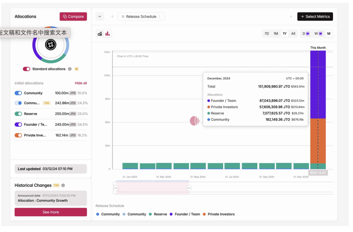 2024年12月,JTO以价值5.6391亿美元的重大解锁事件结束了这一年,释放了151,909,981 JTO进入流通。创始团队主导了解锁,占比57.3%,其次是私募投资者,占比37.9%。这并不令人意外。