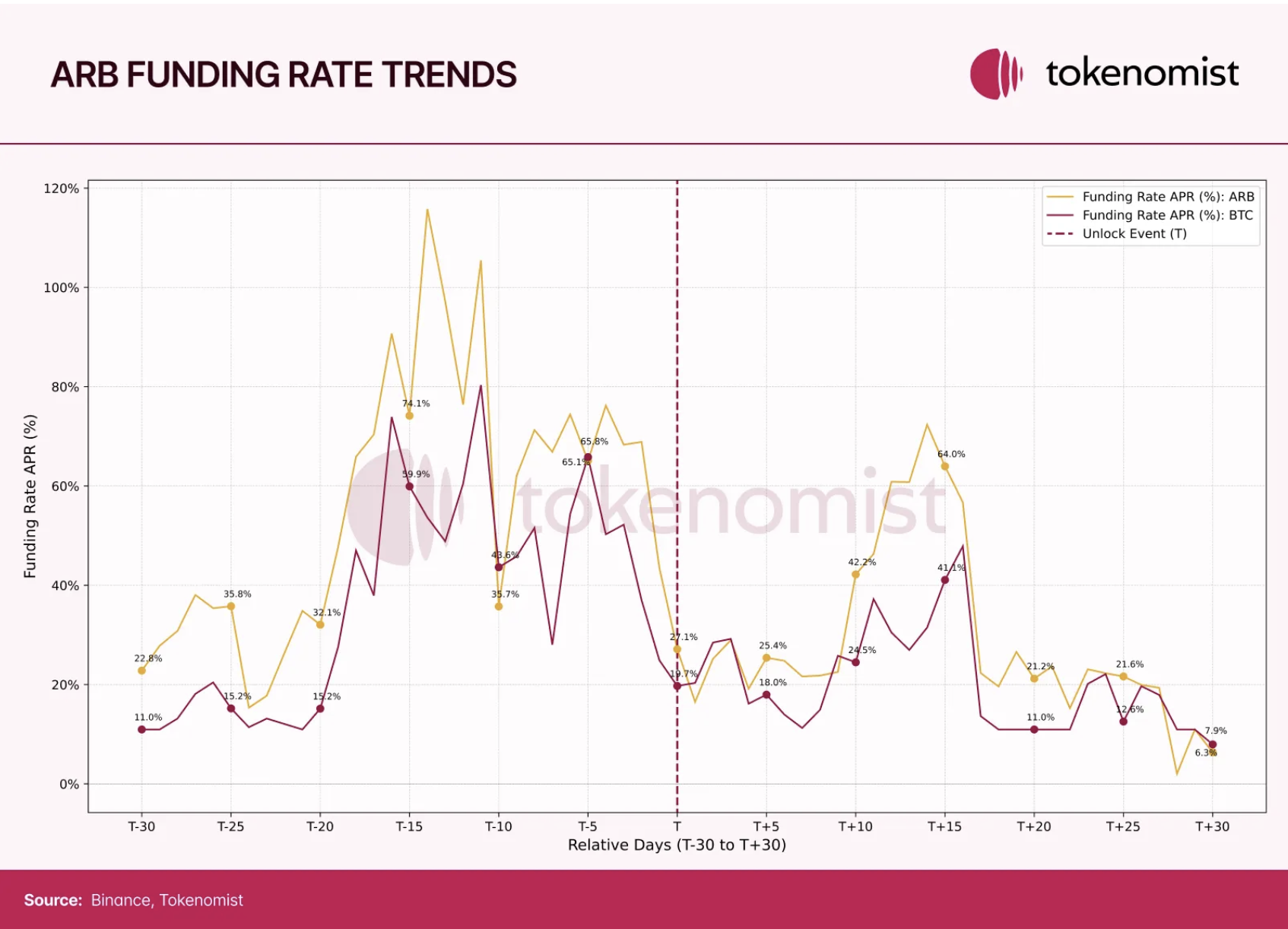 在价格影响方面,在解锁日期前,ARB的价格影响稳定下降,可能反映了对预期供应增加的谨慎交易行为。在解锁后30天内,ARB的价格影响继续下降了33.8%,这可能与市场进入了更多供应有关。