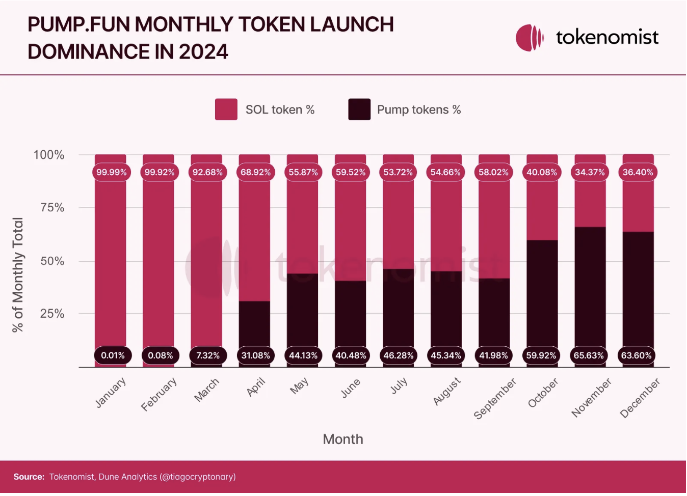 2024年,Memecoin现象的一个主要催化剂是pump.fun,旨在让更多人能够轻松创建和交易自己的代币,极大地降低了进入门槛。自2024年1月推出以来,截至2025年1月6日,已有超过5,581,665个代币在pump.fun上创建。如下图所示,大多数基于Solana的代币现在通过pump.fun而不是传统方法发行。pump.fun的成功也激发了竞争,其他区块链生态系统探索类似的平台,以利用对公平发行代币的日益关注。