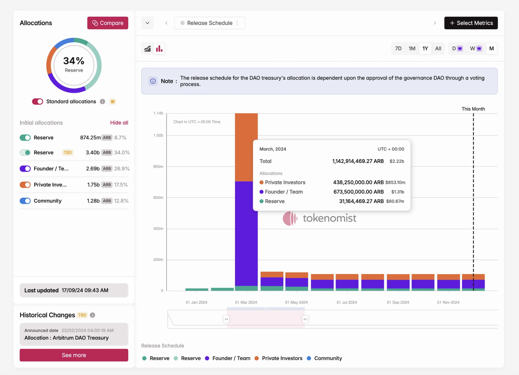 2024年3月,比特币创下7.4万美元新历史高点时,Arbitrum(ARB)开启了当月最大规模的代币解锁事件,解锁价值为22.2亿美元。这是Arbitrum私人投资者和创始人/团队首次解锁,向市场引入了大量新的代币供应。