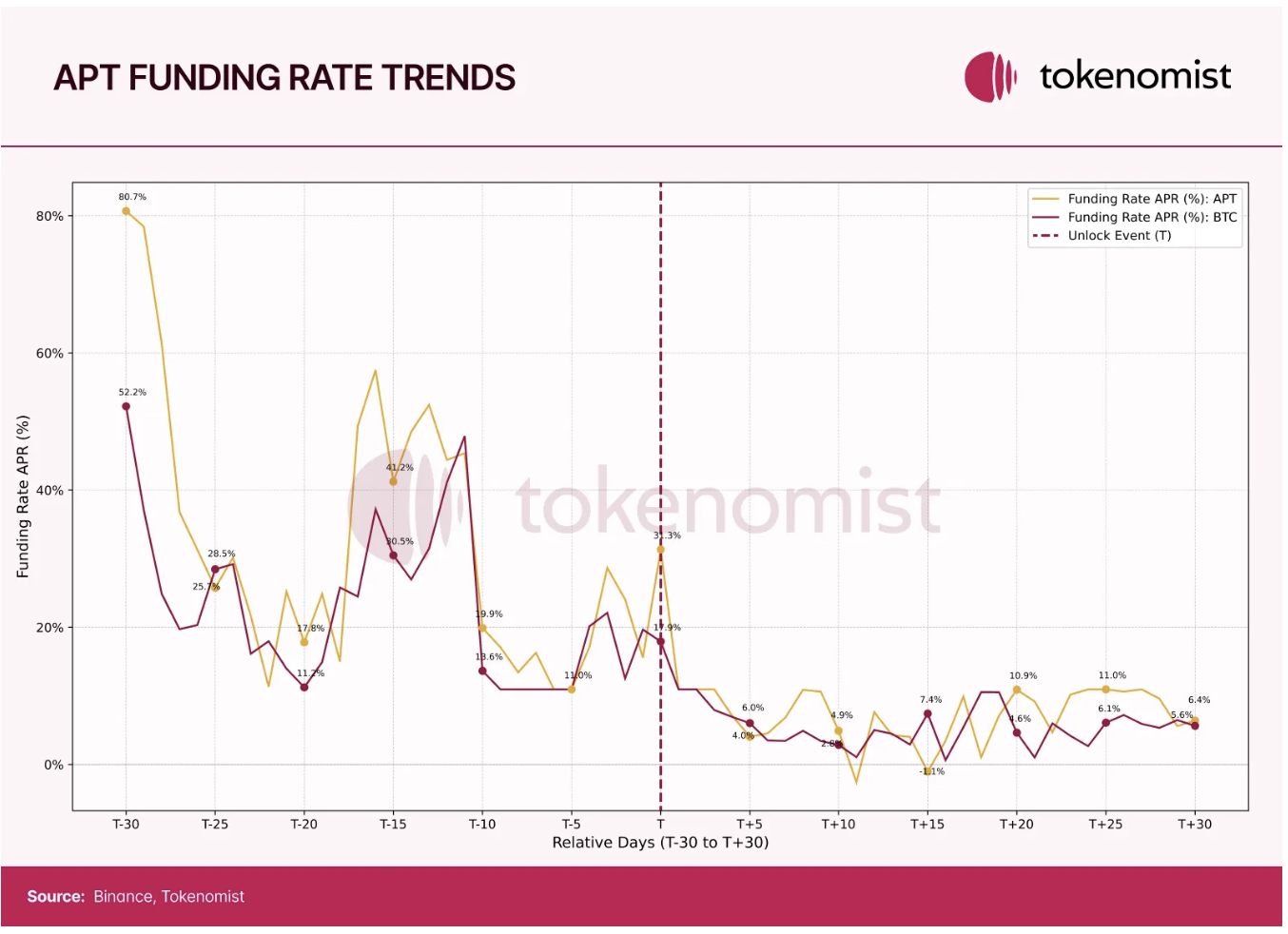 APT的价格影响在解锁前5天内(从解锁前的第20天到第15天)激增了约51.7%,由高涨的交易活动和投机行为推动。然而,从解锁前的第15天开始,价格影响开始稳步下降。在解锁后的时期,价格影响变为负值,并在接下来30天内保持这种状态。在这段时间内,整个加密市场也呈现下降趋势。
